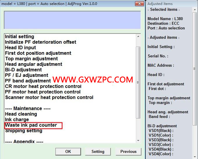3. 選擇Waste ink pad counter(廢墨計數(shù)器)