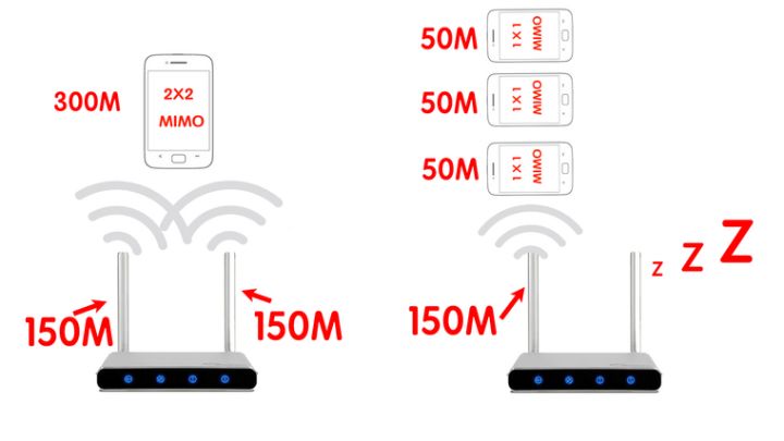 比如說(shuō)你的路由器是2根天線的2×2MIMO,如果你的手機(jī)也支持2×2MIMO,那么路由器會(huì)用兩根天線同時(shí)給手機(jī)傳送數(shù)據(jù);如果你的手機(jī)是1根天線的,那么它也只能用到路由器的1根天線,速度會(huì)比2根天線的慢一半。這個(gè)時(shí)候路由器其他的天線都是在偷懶的。
